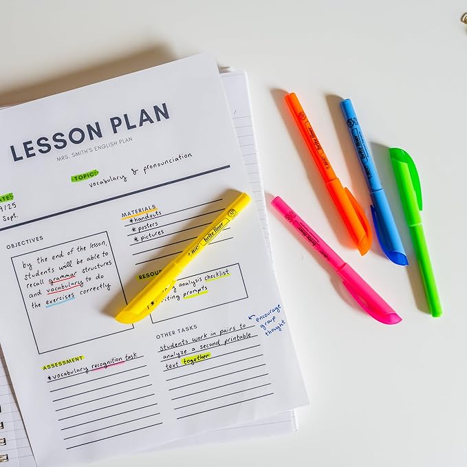 - Highlighter set with translucent ink that emphasizes what's important on the page without obscuring the highlighted text