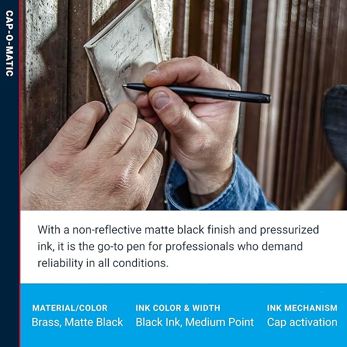 - A Pen Designed to Last: The Military Cap-O-Matic Space Pen features a single-hand activation, a durable matte black finish, ideal for professionals who need a reliable, affordable pen