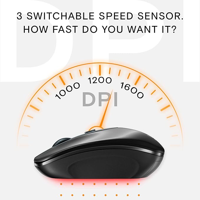 - Adjustable DPI And Long Range: Easily adjust cursor sensitivity depending on your activity - cycle through three DPI levels for your convenience: 1000, 1200, and 1600. 2.4GHz wireless technology allows for a long working distance of up to 39 ft.
