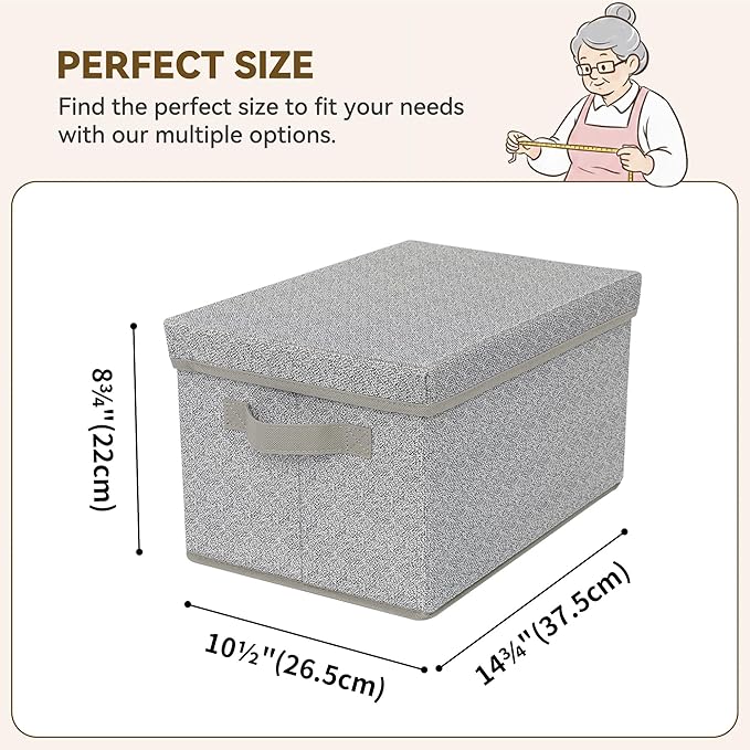 - Perfect Size: These storage bins with lids come in a set of three, each measuring 14¾"L x 10½"W x 8¾"H, and are designed to fit perfectly on most shelves and closets. Plenty of storage space to hold a variety of items, clothes, purses, books, yarns and office supplies, keep your space neat and organized.