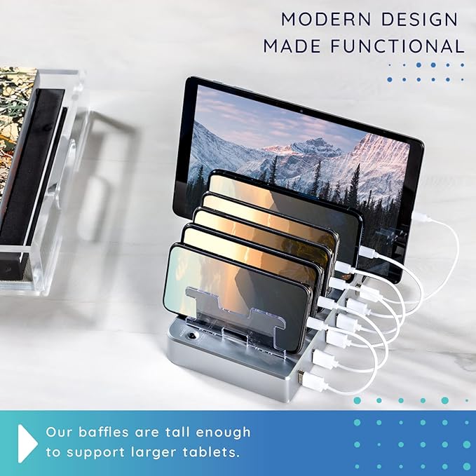 Charging Station for Multiple Devices, with 6 USB Fast Ports, Compatible with Cell Phones, Smart Phones, Tablets, and Other Electronics (Silver)