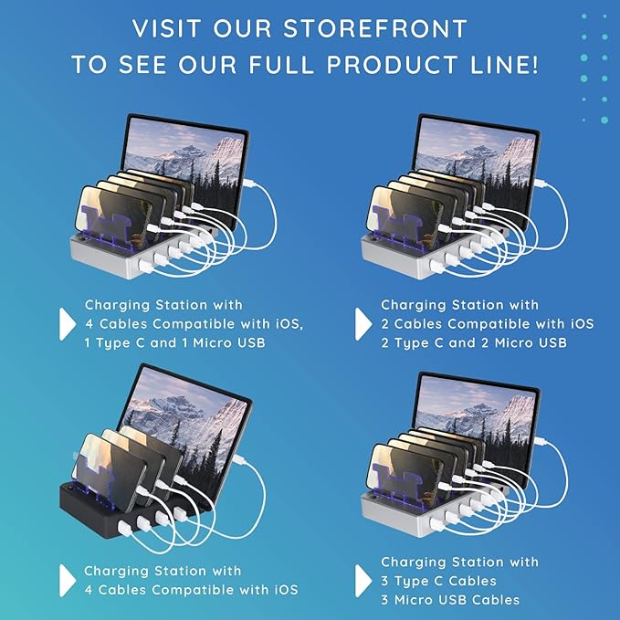 - QUICK CHARGE - Our 6-port, multi charger station offers a battery boost up to 58% faster than other devices offering 2.0 amps or less. Includes (4) iOS Compatible, (1) USB-C & (1) Micro USB Cable.