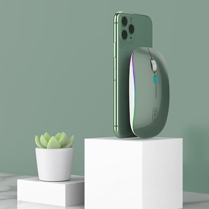 TENMOS Wireless Bluetooth Mouse, LED Slim (Bluetooth 5.1 + USB) 2.4GHz Rechargeable Silent Bluetooth Wireless Mouse for Laptop/MacBook/iPad OS 13 and Above (Blackish Green)