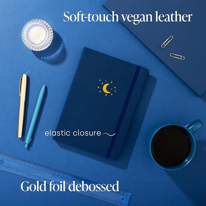 - VEGAN LEATHER HARDCOVER - The sumptuous navy vegan leather cover with moon and stars design is soft to touch and durable.