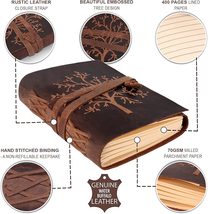 - Handstitched Binding: While many faux leather journals are constructed poorly, our journal features a hand-stitched Coptic leather binding for pages that stay firmly in place. No more worries about losing precious pages out of your leather journals for women