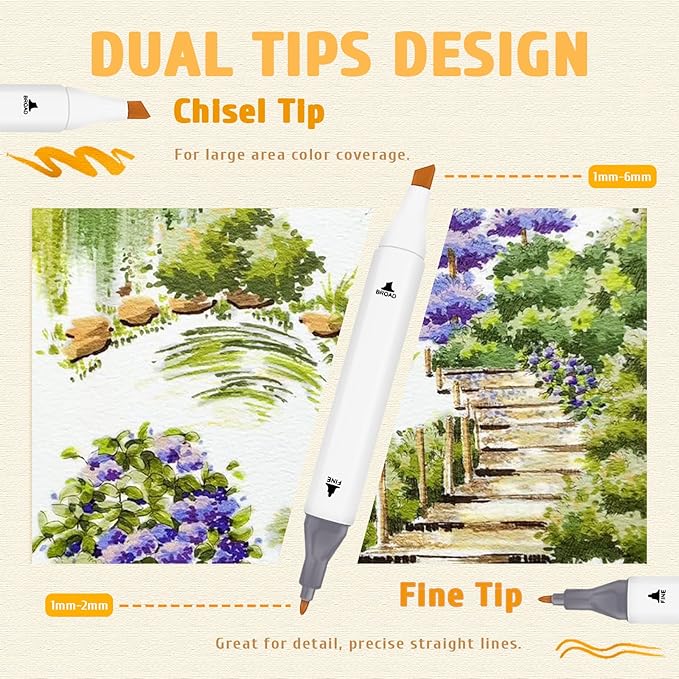 - DUAL TIP ALCOHOL MARKERS: SiwaQio coloring markers feature a broad chisel tip that creates 1–6 mm strokes for fast & full coverage, and a fine tip that draws 1–2 mm for detailed work. The ergonomic square barrel offers a comfortable grip for smooth, fatigue-free coloring. Bring your art to life