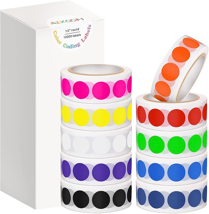 10000 PCS 1/2" Round Color Coding Labels Circle Dot Stickers, 10 Assorted Colors for Home Office Classroom (10 Rolls,1000 Labels/Roll)