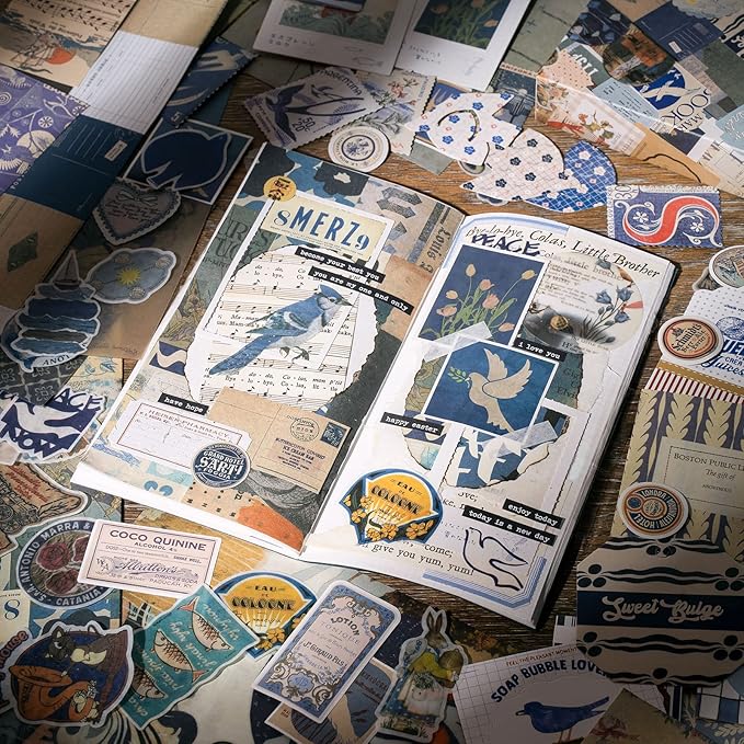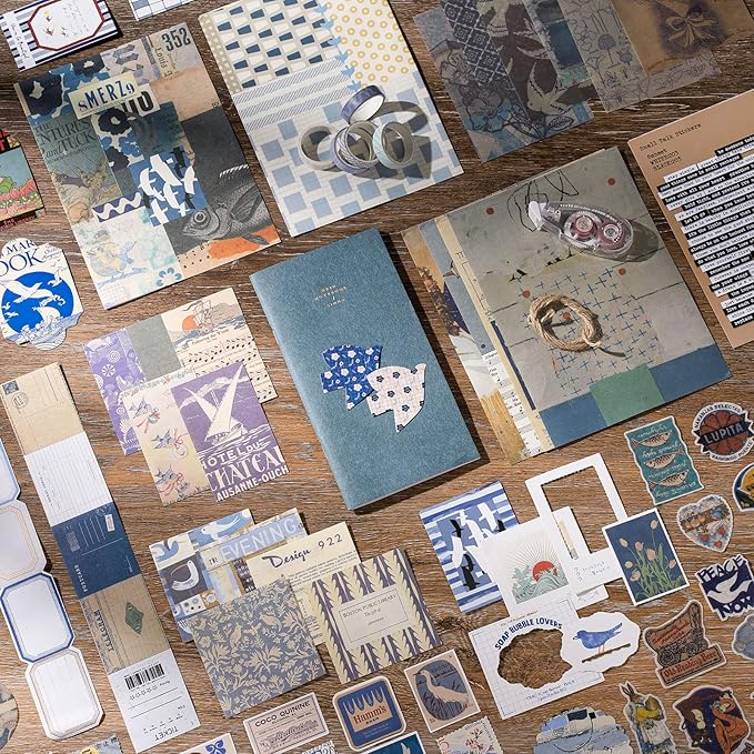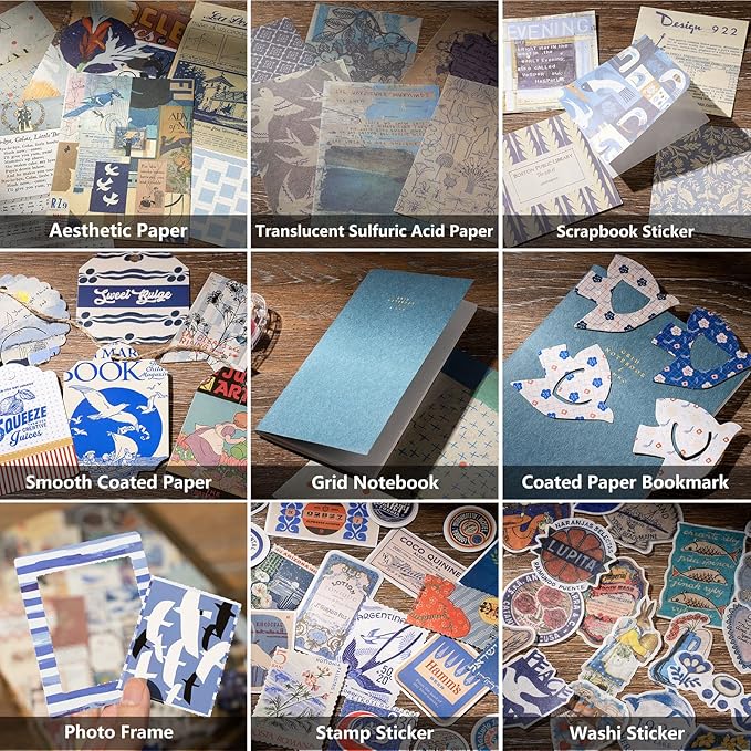 - Blue Themed Junk Journal Ephemera Pack - Each kit comes with vintage ocean themed Junk Journal supplies, including 2pcslarge aesthetic paper, 4 pcs Vintage Scrapbook Paper, 6 pcstranslucent sulfuric acid paper, a grid TN notebook, 4 pcs coated paper bookmark, 10 pcs scrapbook stickers, 6 pcs photo frame, 6 pcs smooth coated paper, 4 pcs lable frame/sulfuric acid paper, 20 pcs stamp stickers, 20 pcs washi stickers