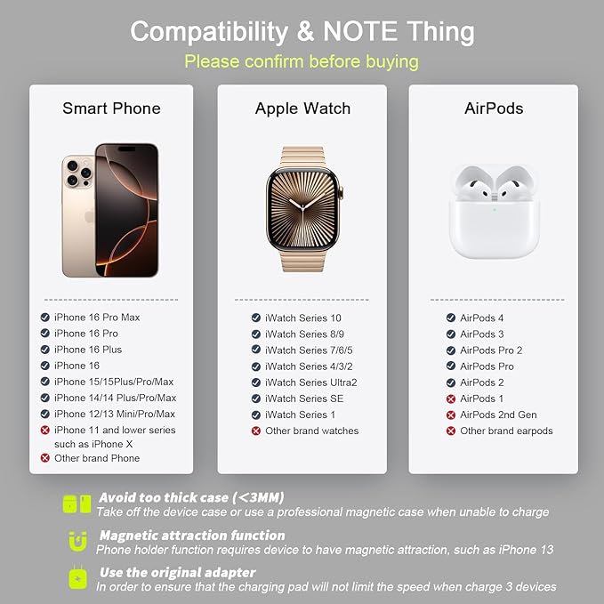 - Compatible Phone Models : iPhone 16, iPhone 16 Plus, iPhone 16 Pro, iPhone 16 Pro Max, iPhone 15, iPhone 15 Plus, iPhone 15 Pro, iPhone 15 Pro Max, Phone 14, iPhone 14 Plus, iPhone 14 Pro, iPhone 14 Pro Max, iPhone 13 mini, iPhone 13, iPhone 13 Pro, iPhone 13 Pro Max, iPhone 12 mini, iPhone 12, iPhone 12 Pro, iPhone 12 Pro Max, AirPods 2/3/4/Pro, IWatch 2/3/4/5/6/SE/7/8/9/10(Compatible with MagSafe cases) Note: Do not compatible for Samsung Galaxy, Android model iPhone 16, iPhone 16 Plus, iPhone 16 Pro, iPhone 16 Pro Max, iPhone 15, iPhone 15 Plus, iPhone 15 Pro, iPhone 15 Pro Max, Phone 14, iPhone 14 Plus, iPhone 14 Pro, iPhone 14 Pro Max, iPhone 13 mini, iPhone 13, iPhon… See more