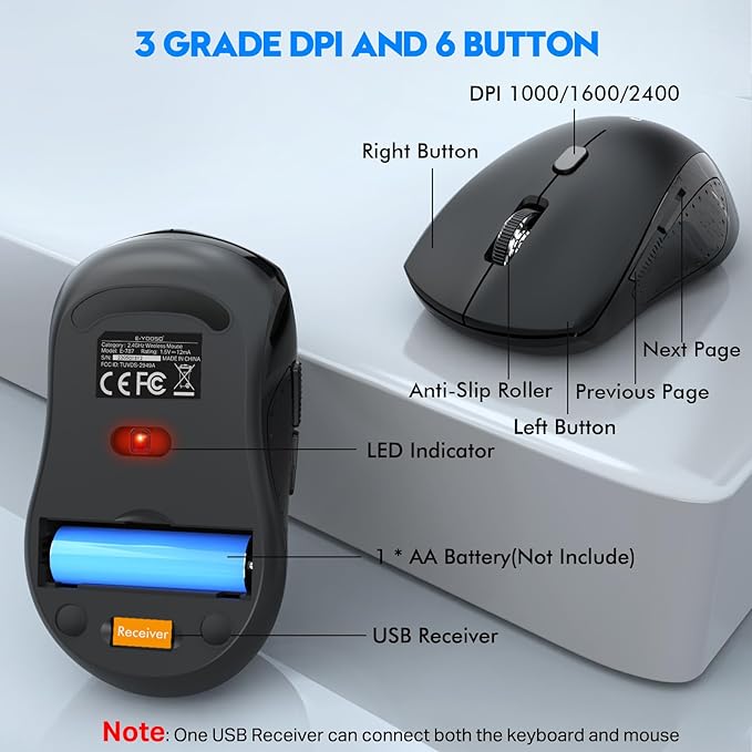 - 【2.4G STABLE WIRELESS CONNECTION】: No need to install any drivers, E-YOOSO wireless keyboard and mouse use 2.4G wireless connection technology, up to 10m (33 feet), just plug and play, the mouse and keyboard shares the same USB Receiver