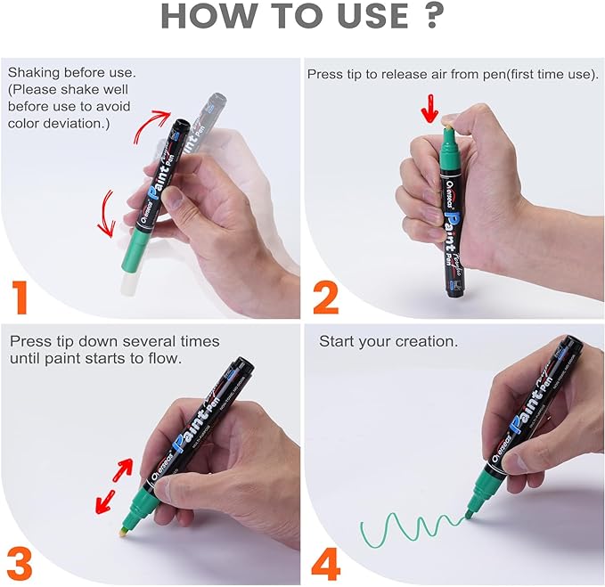 - High Quality: Durable medium round nib allows smooth and precise application. These acrylic paint pens are perfect for drawing, painting and coloring in arts and crafts, DIY projects, scrapbooks, gift card marking, journals, calendar, planners, coloring books, tires and more