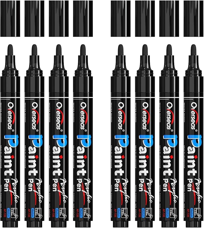 Overseas Black Acrylic Paint Markers - 8 Pack Medium Tip Acrylic Paint Pens, Water Based, Quick Drying, Waterproof, Non Toxic Permanent Markers for Rock, Wood, Plastic, Metal, Canvas, Glass, Fabric