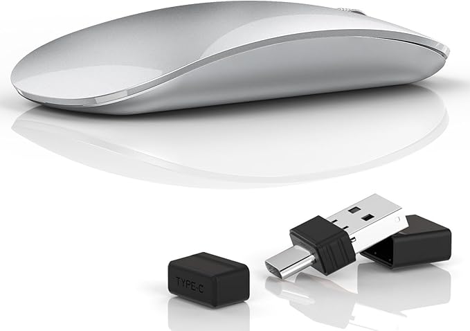 Uiosmuph G11 Wireless Mouse, USB C Rechargeable Computer Mouse, Slim Silent Mice 2.4GHz Optical with USB Nano Receiver and Type C Receiver for Laptop/Mac/PC - Silver