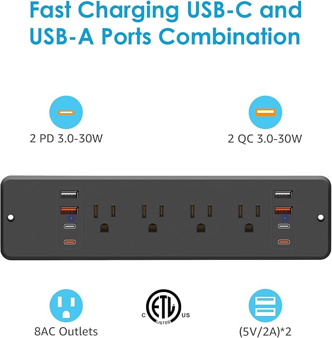 - 30W Fast Charging Power Strip: 8 Outlets Output rating 10 Amp / 125 Volt / 1250W. Come with fast charging QC 3.0 30W Max USB-A port and PD 3.0 30W Max USB-C port. different phones, iPads, laptops, and many many other things and this has every single plug in one strip, USB, usb c, and standard plug. So there is good future-proofing.