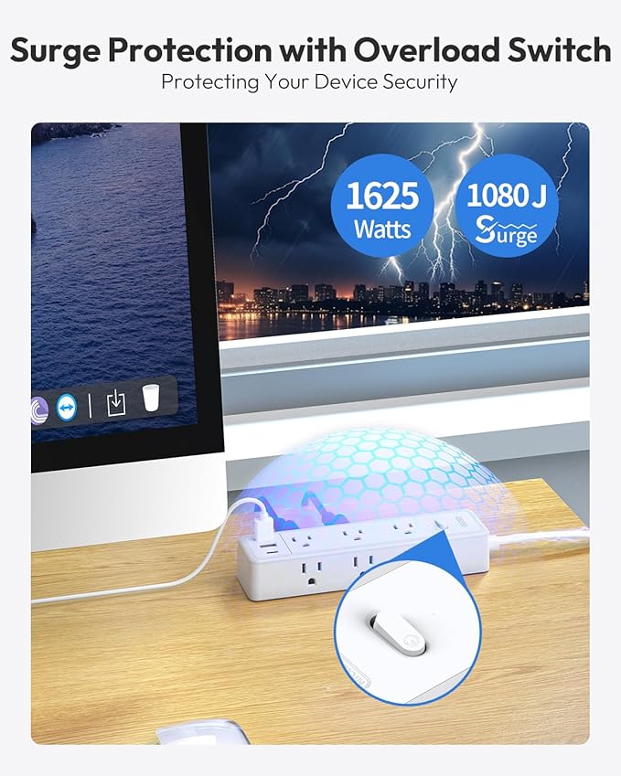 - 【Surge Protector Power Strip with Overload Switch】:The Surge protector extension cord has surge protection (1080J) and protects your electrical appliances from lighting, surges, or spikes. The on/ off switch can automatically shut off when the power exceeds rated value(1625W), to protect your expensive devices like computers, TV at home, office, college dorm, etc.