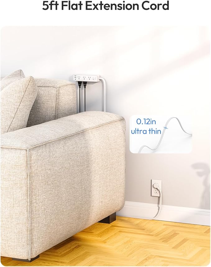 - 【Wall Mount & Space Saving】:the white power strip back has two mounting holes (includes 2 screws and mounting template). this wall-mounted power strip to be installed in narrow applications, such as behind a bed, behind the sofa, bookcases, and workbenches... saving you space. This low profile extension cord has 4 silicone pads on the bottom and can also be used as a desktop power strip without slipping off.
