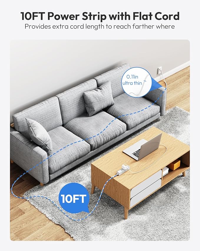 - 【Flat Extension Cord 10 Feet Suitable for Anywhere】:The white power strip 10 ft cord allows you to easily connect to a distant electrical outlet, while the 0.11-inch ultra-thin flat extension cord is flatter and is more flexible than traditional round extensions. can be hidden under carpet, allowing doors to close seamlessly.
