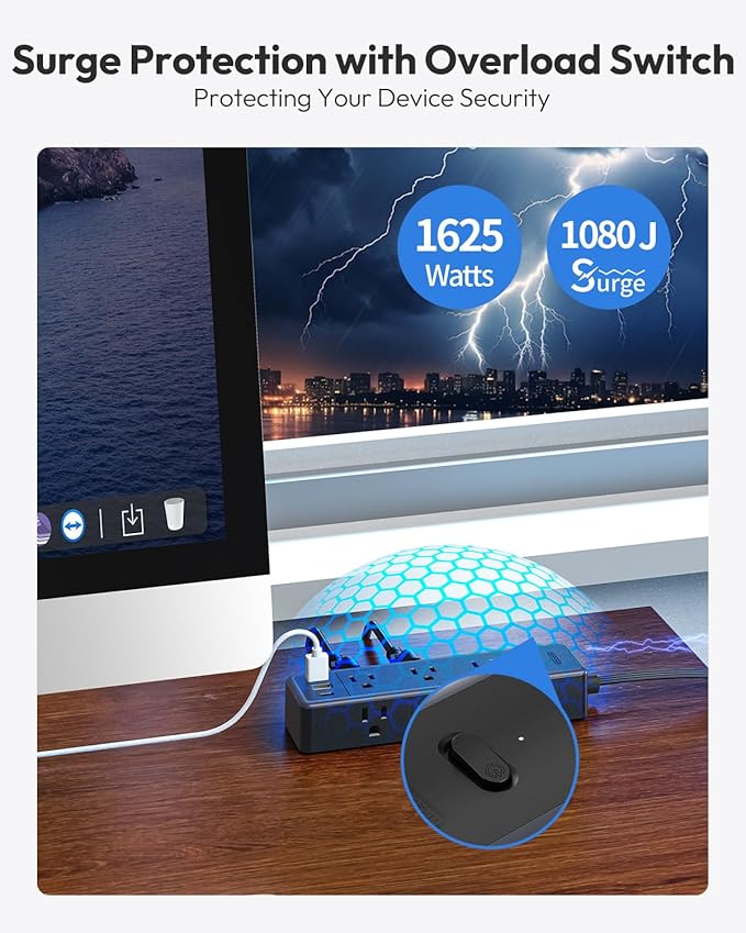 - 【Surge Protector Power Strip with Overload Switch】:The surge Protector extension cord has surge protection (1080J) and protects your electrical appliances from lighting, surges, or spikes. The on/ off switch can automatically shut off when the power exceeds rated value(1625W), to protect your expensive devices like computers, TV at home, office, college dorm, etc.