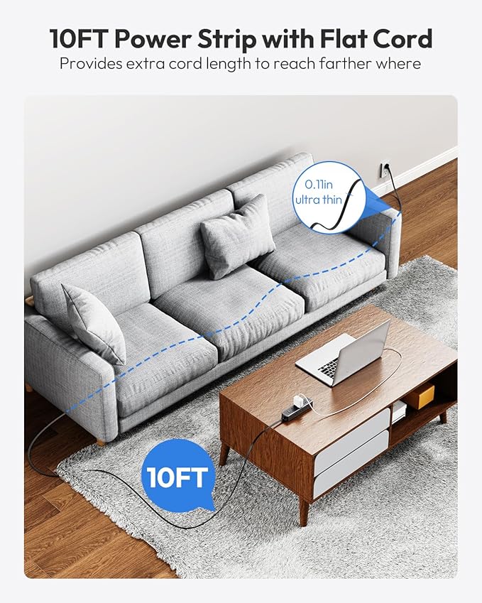 - 【10 FT Extension Cord with Thin Cord】: The white extension cord 10 feet allows you to easily reach distant power outlets, ultra flat extension cord making it can be hidden under rugs, under furniture, and under the door . The flat plug power strip fits easily in tight spaces like behind furniture, bookshelves, and desks.45°angled plug doesn’t block the bottom receptacle.