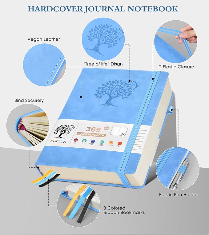 - 【365 Pages Premium Thick Lined Paper】: Our PERCUN lined journal notebook is made of 365 pages high-quality 100Gsm thick ruled pager with an acid-free light Ivory paper that is thicker than normal. This premium quality paper will not cause bleeding, ghosting or smudging and is suitable for most types of pens,provides ample space for journaling, note-taking, and creative writing. The line spacing is 7mm, making it easy to write legibly and neatly.