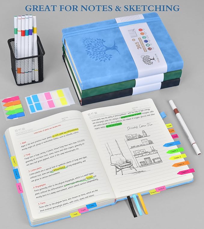 - 【180°Lay Flat for Writing】Our notebook also comes with 180°Lay Flat Journal Notebook, which makes writing a breeze. The elastic pen holder and bookmark ensure that you never lose track of your pen, and the 2 elastic closures ensure that your journal stays securely closed. The 3 colored ribbon bookmarks and 3 sticky labels provide even more ways to customize your journal to your liking.Built-in back pocket that is great for storing loose notes, cards, or other important items.