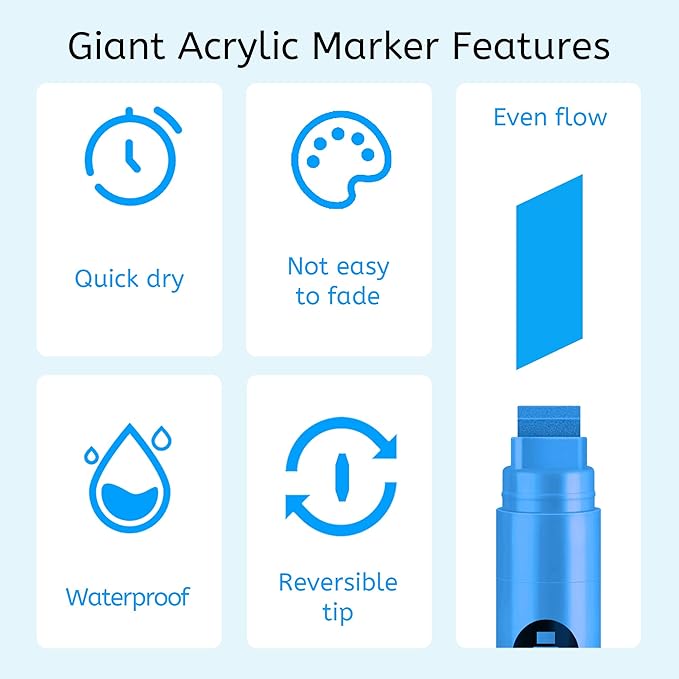- Jumbo Permanent Markers Blue Set: BIGTHUMB jumbo blue markers are made with the highest-quality non-toxic, acid-free, no odor, no-leakage water-based acrylic ink that is waterproof, quick dry, long-lasting, and smooth ink flow. Each fat permanent marker conforms to ASTM d-4236 and EN-71 safety standards