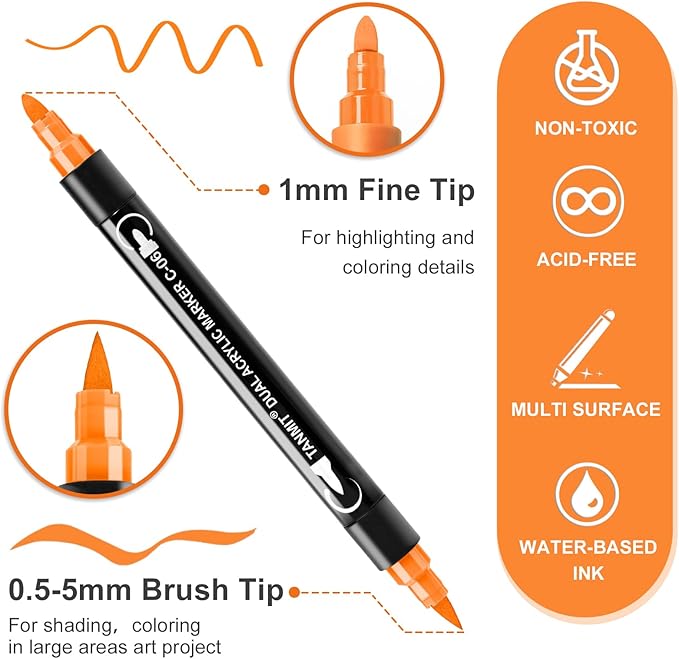 - VERSATILE DUAL TIP: Our acrylic paint markers come with a unique dual-tip design. One end features a 1mm fine tip for outlining and detailing intricate designs, while the other end has a 0.5-5mm broad tip for large areas of painting and coloring, allowing you to create different strokes by changing the brush pressure, saving the trouble of changing nibs, and bringing more convenience to your creation, meet the different needs of professionals and amateurs.
