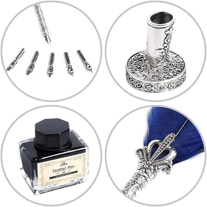 - High Quality Feather Pen Set: This fountain pen refills is made from premium quality material. This blue feather quill pen made with precious quill feathers and pen body is made up of stainless steel. The calligraphy pen set provides excellent control and stability.
