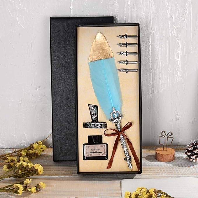 Quill Feather Pen and Ink Set,Calligraphy Set,Calligraphy Kits Include Antique Quill Feather Pen,6 Nibs,1 Bottles Inks,Pen Holder for Beginners Birthday Gift (Sky Blue)