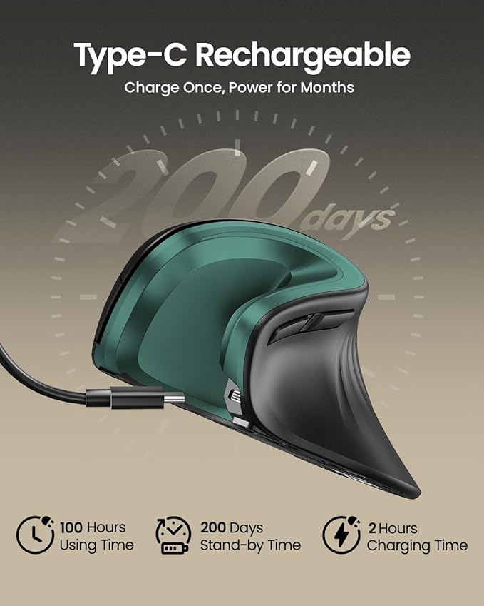 - Rechargeable Ergonomic Mouse: The Bluetooth Vertical Mouse has a built-in 500mAh Li-Ion battery that can be conveniently recharged using the included Type-C cable