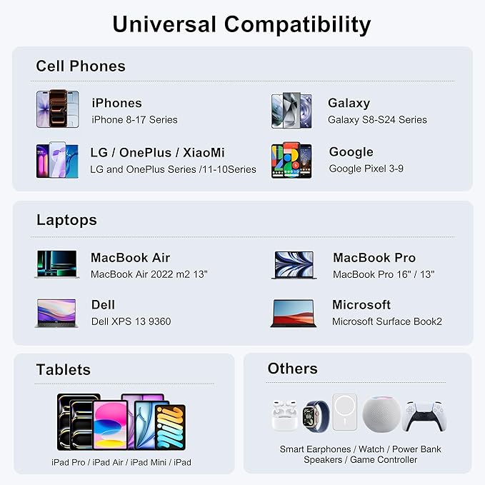 - Universal Compatible Charging Block:Say goodbye to your old chargers, this USB C charging station meets your daily charging needs. USB C Fast Charger Block compatible with MacBook Pro MacBook Air MacBook,iPhone16/16 Pro/16 Plus/16 Pro Max,iPhone 15/15 Plus/15 Pro/15 Pro Max iPhone 14/14 PRO/14 PRO MAX/13/ 13 Mini/ 13 Pro/ 13 Pro Max iPhone 12/ 12 Mini/ 12 Pro/ 12 Pro Max/ XS/ XS Max/ XR/ X/ 11/ 11 Pro/ 11 Pro Max/ Samsung Galaxy S23 Ultra/ S22/ S21+/ S21/ S21 Ultra/ S21 FE/ S20+/ S20/Dell XPS 15/ 13 Google Pixel Pro Mini Series/ Air Series AirPods 4/Apple AirPods4,Watch10,Ultra2