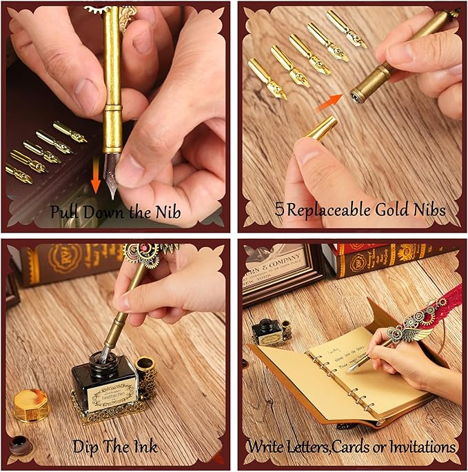 - Quill Pen and Ink Set:Includes 1*red feather pen,1*leather notebook,1*bottle of black Ink,1*pen holder,5*stainless steel replaceable nibs,the vintage calligraphy pen set has everything you need.