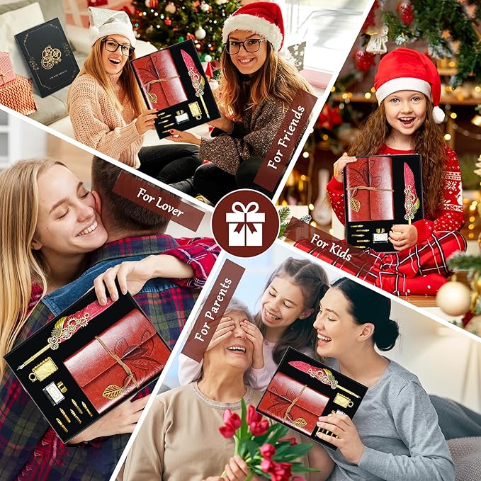 Feather Quill Pen and Ink Set,Antique Calligraphy Set with Leather Journal Notebook,Feather Pen,5 Gold Nibs,Pen Holder,Ink,Calligraphy Kits for Beginners Christmas Gift