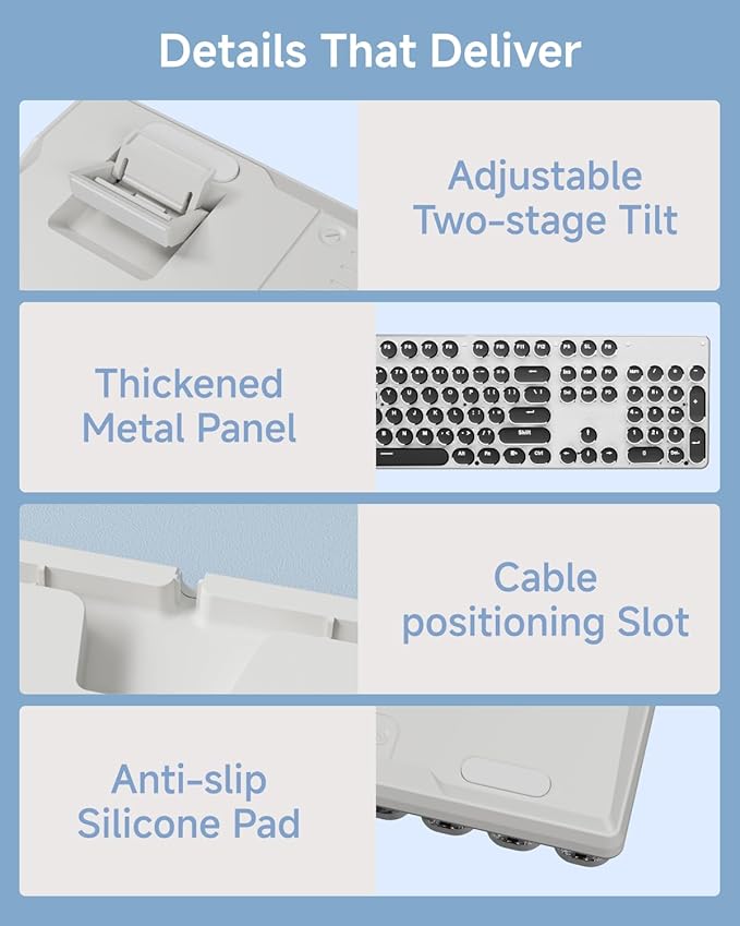 - Retro Typewriter Style Round Keycaps: TK950 wireless typewriter keyboard uses double-shot injection retro punk round keycap with clear backlight, extremely durable. Stepped floating keycaps that fit your fingertips perfectly, precise position. Ergonomic foot support makes typing less tiring and more comfortable. Highly-durable mechanical blue switch responds faster and more quickly, accompanied by crisp click.