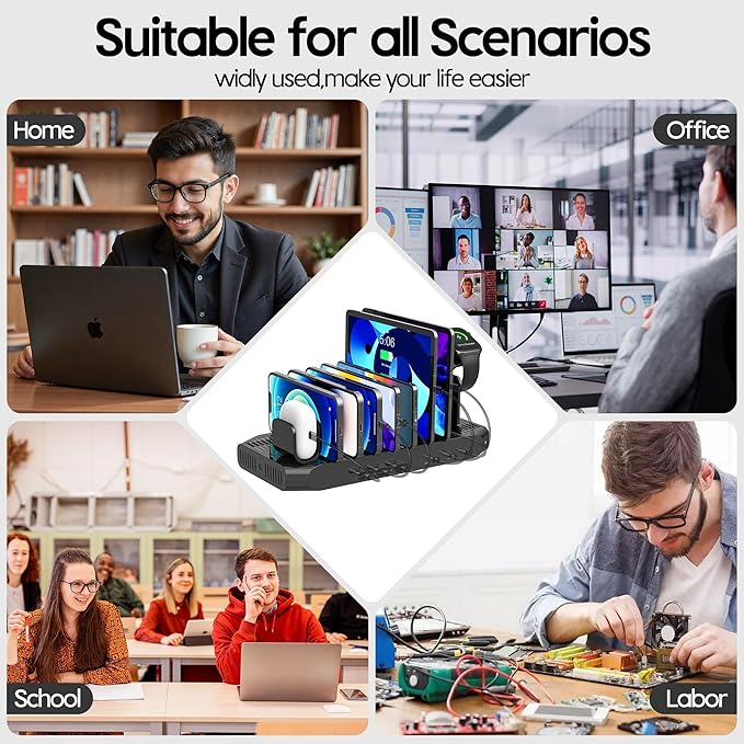 - Charge & Organized: Made with high-quality durable ABS environmentally friendly material. The anti-slippery base keeps this charging station stable and steady. NO more cluttered cables, NO bunch of chargers, designed to fit anywhere, company, office, boardroom, home, living room, bedroom, kitchen, hotel, restaurants, classroom.