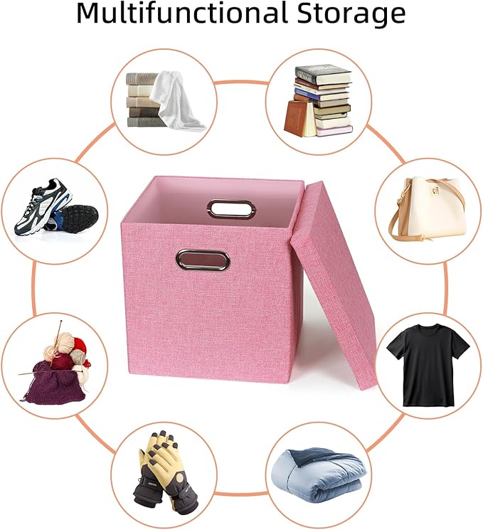 Storage Bins with Lids, Collapsible Linen Fabric Boxes Organizer Containers with Lid Foldable Storage Box Basket for Closet, Shelves, Home, Office, 11 x 11 x 11.4 Inch, 4 Pack, Pink