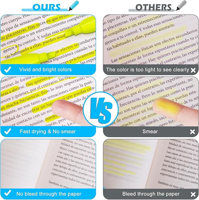 - Fast Drying & Durable: The highlighters pens use durable, quick-drying ink, allowing highlighted marks to be clearly visible without worrying about the ink staining your hands and books. Each highlighter is equipped with a pen cap to avoid ink from drying out for long-lasting use. Please remember to be sure after use keep the pen cap closed to prevent the ink from drying out.