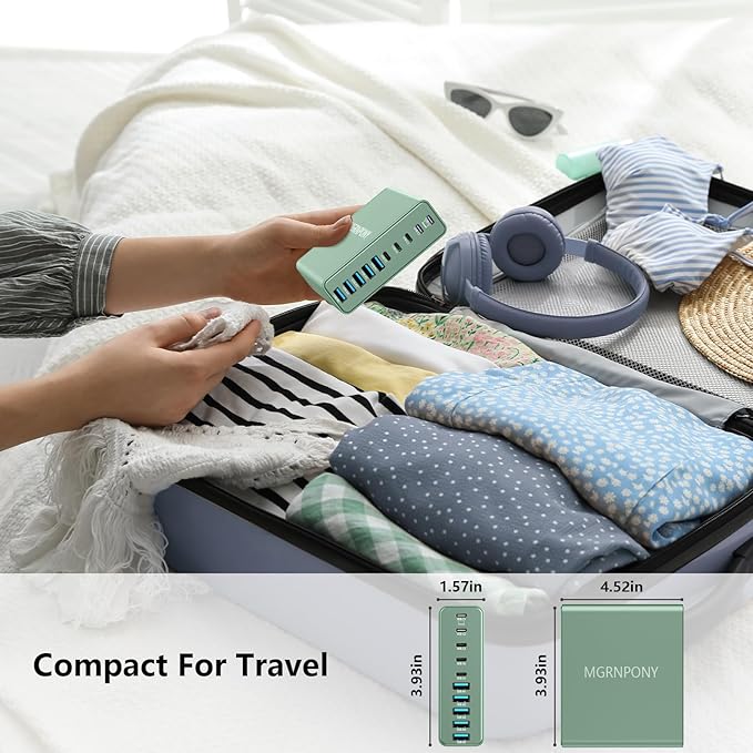 - Multiport USB-C & A Charging Station: Boasting to charge up to 10 devices at once, this versatile charging block features 5 USB-C ports and 5 USB-A ports. The dedicated USB-C port powers newer electronics like laptops, while the legacy USB-A ports support older devices. Unlike most chargers with false advertising and outputs that slow down when multiple ports are used.