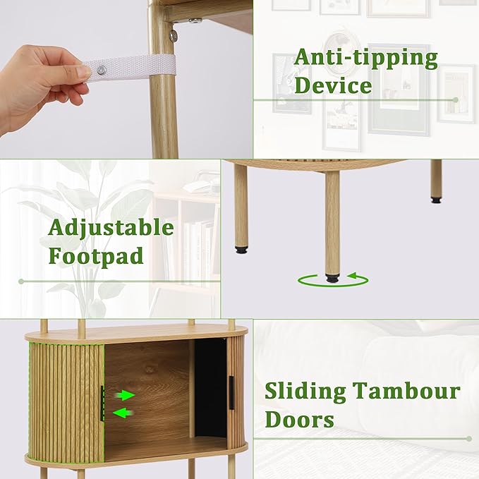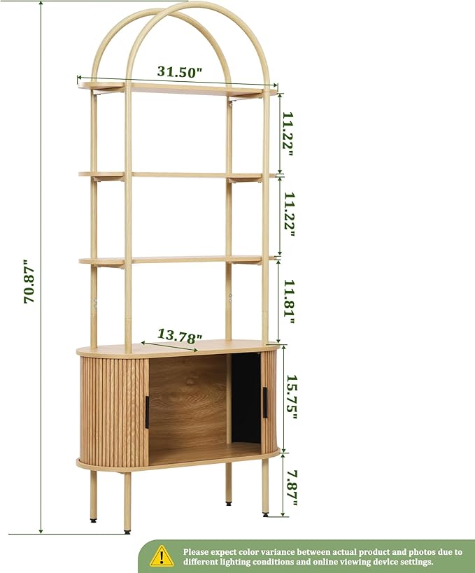 - 【Mid-Century Modern Style】 The Janmer Home arched bookshelf features a with a rounded top, oval shelves, and a tambour sliding cabinet door, making it a versatile addition to your living room, bedroom, home office, or kitchen. It functions not only as a bookshelf or plant stand but also as a freestanding storage rack, meeting your various needs while keeping your space tidy, organized, and stylish