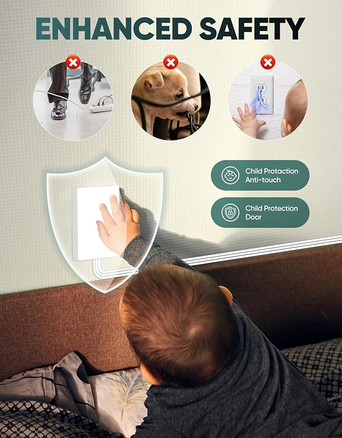 - 【SAFE FOR KIDS AND PETS】Our baby proof outlet covers have child and pet-friendly design, featuring a neat socket outlet cover and flat wall plug, prevent access to and chewing of dangerous electrical plugs and cords. Rest easy with our outlet plugs baby proofing, ensuring a secure environment around slim outlet plug, and multi outlet extension cord.