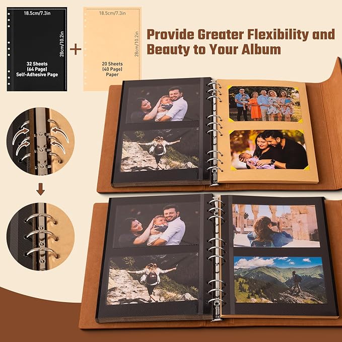 - Scrapbook Photo Albums: Each family photo album comes with high quality standard 6-ring binders, you can change the position of the paper at will, perfect to DIY, adding the kraft paper and it becomes a nice scrapbook album.