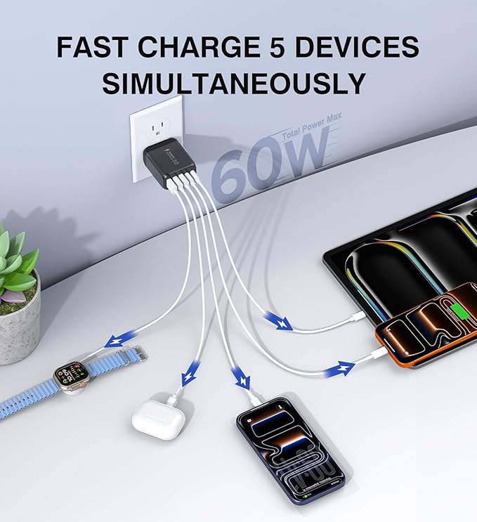 - Compact and Portable USB and USB C Charging Block: The 5-port charging cube boasts an incredibly compact size that enhances portability. All of this power is housed in a pocket-friendly compact body wherever the journey takes you. Perfect for home, office and on the go. We offer this 60W 5-port usb c wall charger (cable not included). If you have any problems with the wall charger fast charging, please contact us