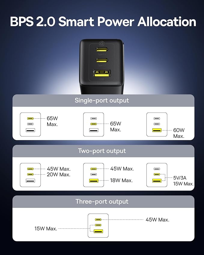 - Fast Charging for 3 Devices: Connect a single device for a powerful 65W max charge – enough to fast-charge a MacBook Air at full speed. Effortlessly charge up to three devices simultaneously (USB-C + USB-C + USB-A). Intelligent technology dynamically allocates the optimal wattage (up to 65W total) to each connected device for safe, efficient charging every time.
