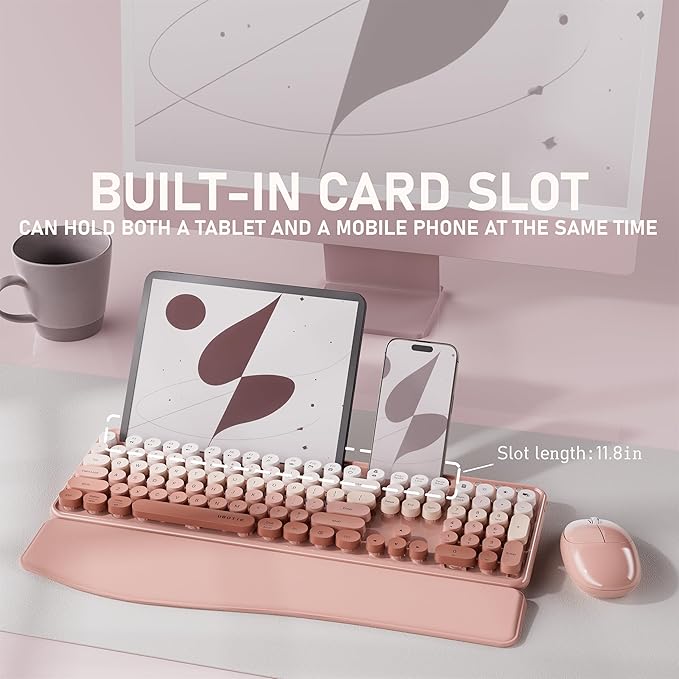 UBOTIE Wireless Keyboard and Mouse Combo with Phone Holder and Wrist Rest, Round Colorful Keys, Power Switches, 2.4GHz USB Receiver, Full-Size QWERTY Layout for PC Laptop(Peach