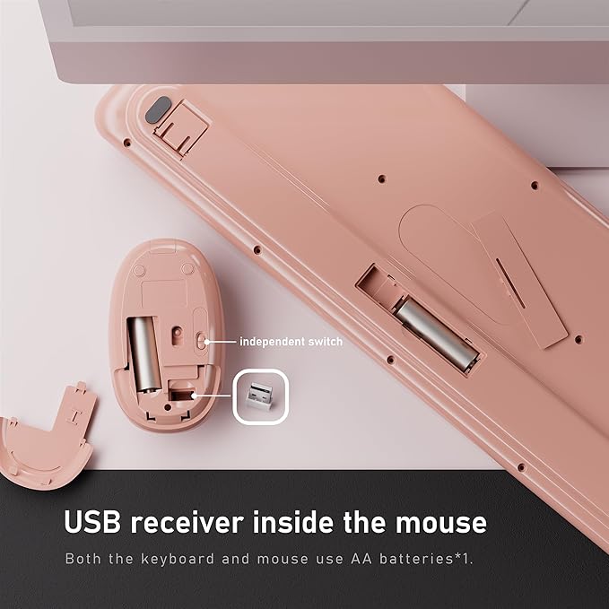 - Keyboard and mouse power switches – Extend battery life with on/off buttons on both devices