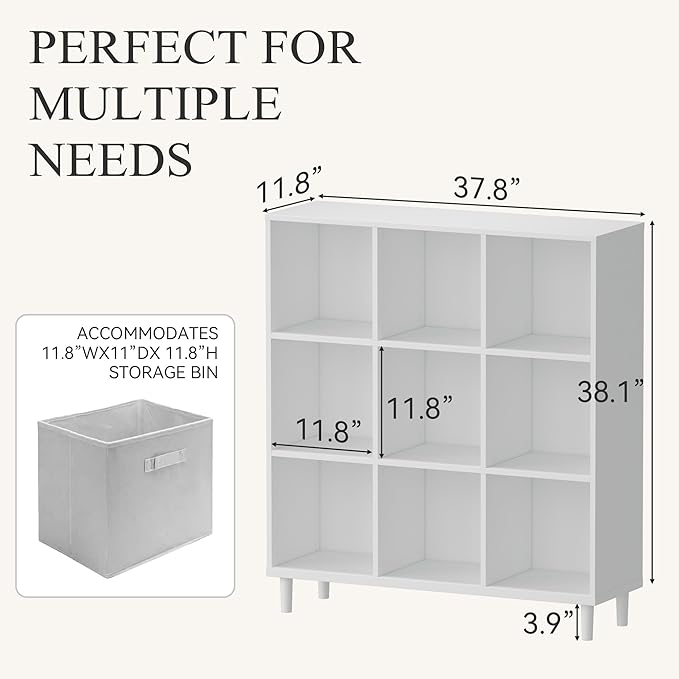 Wood Cube Storage Organizer White Bookshelf - 3-Tier Freestanding Storage Cabinet with Legs for Home Office, 9-Cubes Open Shelf