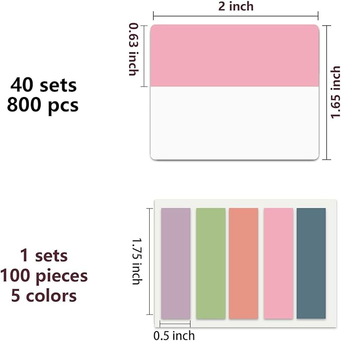 - Sticky Tabs: 900pieces 21 sets in total, 900 pieces 2 inch sticky tabs in 40sets with different pastle colors,100 pieces 0.5 in tabs in 1sets, 20 pieces each color