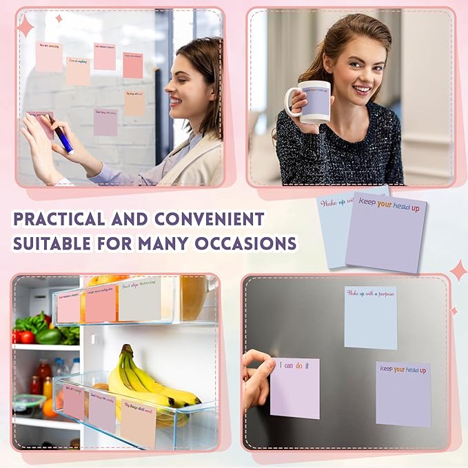 - Quality Material: inspirational sticky notes are designed with self adhesive, strong adhesion, and can be easily pasted on many smooth and clean surfaces, such as books, doors and windows, refrigerators, cabinets, desks, drawing boards, etc.; Moreover, they will not leave behind after removal any sticky residue, odorless and smooth, easy to peel and stick, good adhesion, not easy to remove, bring convenience to your daily work and study