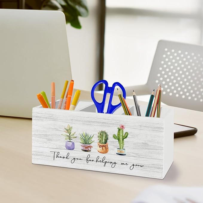 Teacher Pen Pencil Holder Organizer for Desk Accessories, Teacher Appreciation Gifts, Thank You for Helping Me Grow Wooden Box Sign Desk Decor for Office Decoration, Best Teachers Gifts