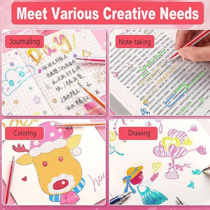 - VERSATILE FOR EVERY CREATIVE NEED: Whether you’re journaling, scrapbooking, card making, or doodling, these glitter gels pens sets offer limitless possibilities. Use them on dark paper, planners, or DIY crafts to create stunning visual effects with shimmering ink